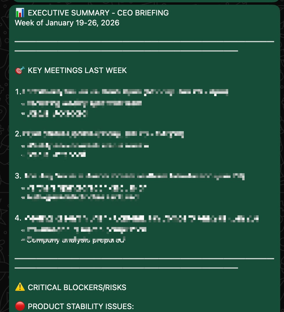 Executive digests (weekly CEO briefs from calendar + email)