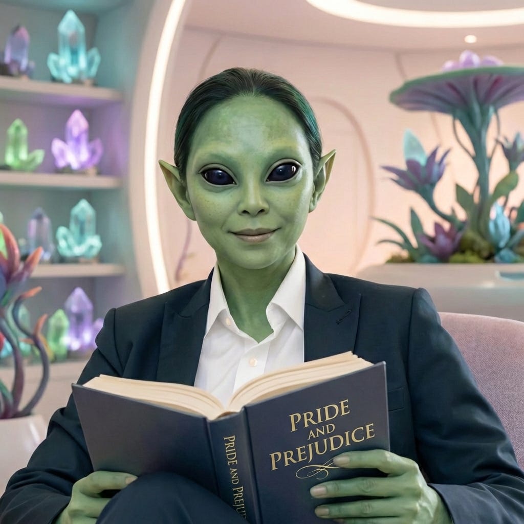 In Pride and Prejudice (Jane Austen), Alien Me learns how humans misread each other spectacularly in love.